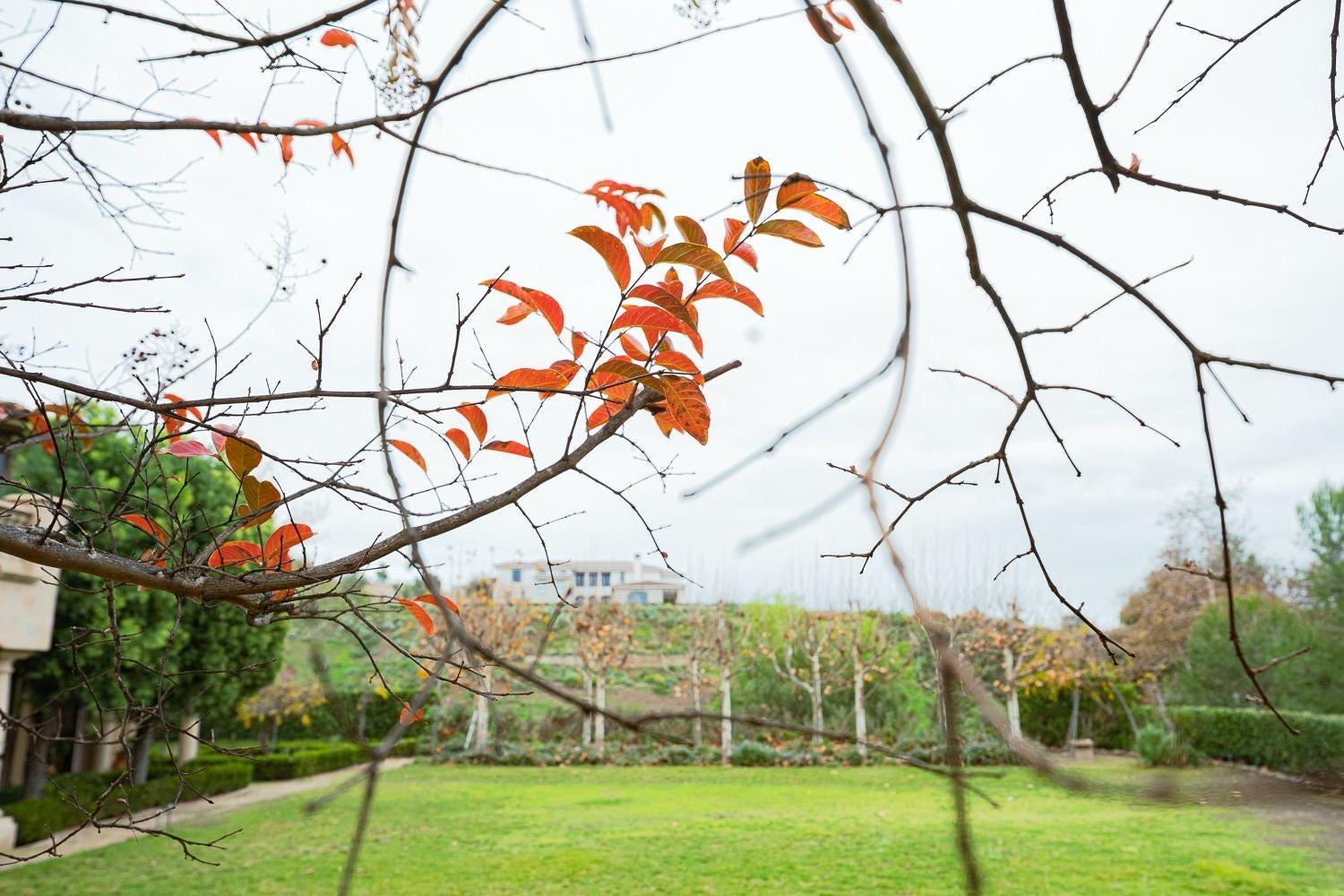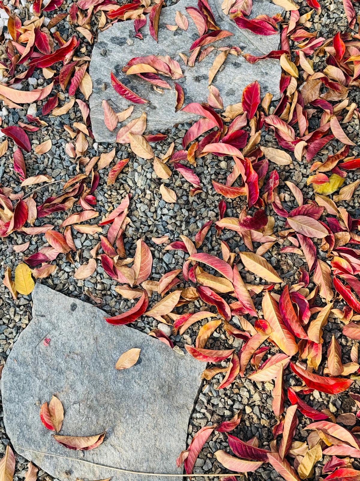 坐在窗前,玻璃壺中的碧螺春,捲曲的嫩芽在熱水中舒展開來,上下翻飛,小啜一口,騰騰熱氣伴著濃濃茶香,驅走了森森的寒意。望出窗外,台階上、碎石道、草叢中,遍布各色落葉,在冬雨洗刷下,清爽明亮,霜葉滿階紅,鐵鏽紅的紫薇落葉顯得格外耐看耐賞。