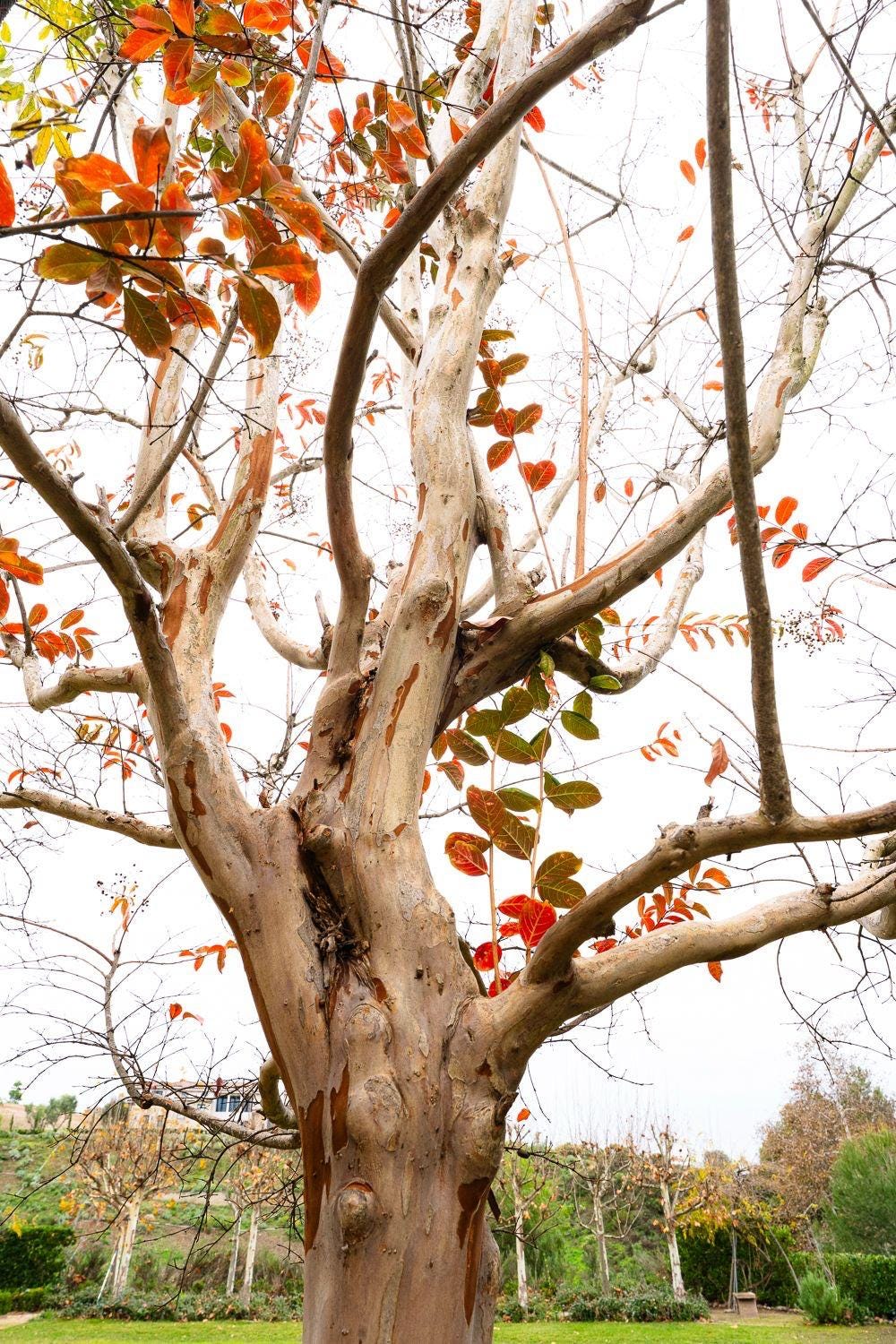 有人説,枝幹光滑無皮,連猴子都不能攀援而上,取了”猿滑樹”、”無皮樹” 的別名。我們這裡沒見到猴子,松鼠倒是很多。看牠們忙進忙出,從羅漢松跳到黑松,經過紫薇樹,好像只是一掠而過,未曾看過牠們攀爬,也許知道這樹不好爬。