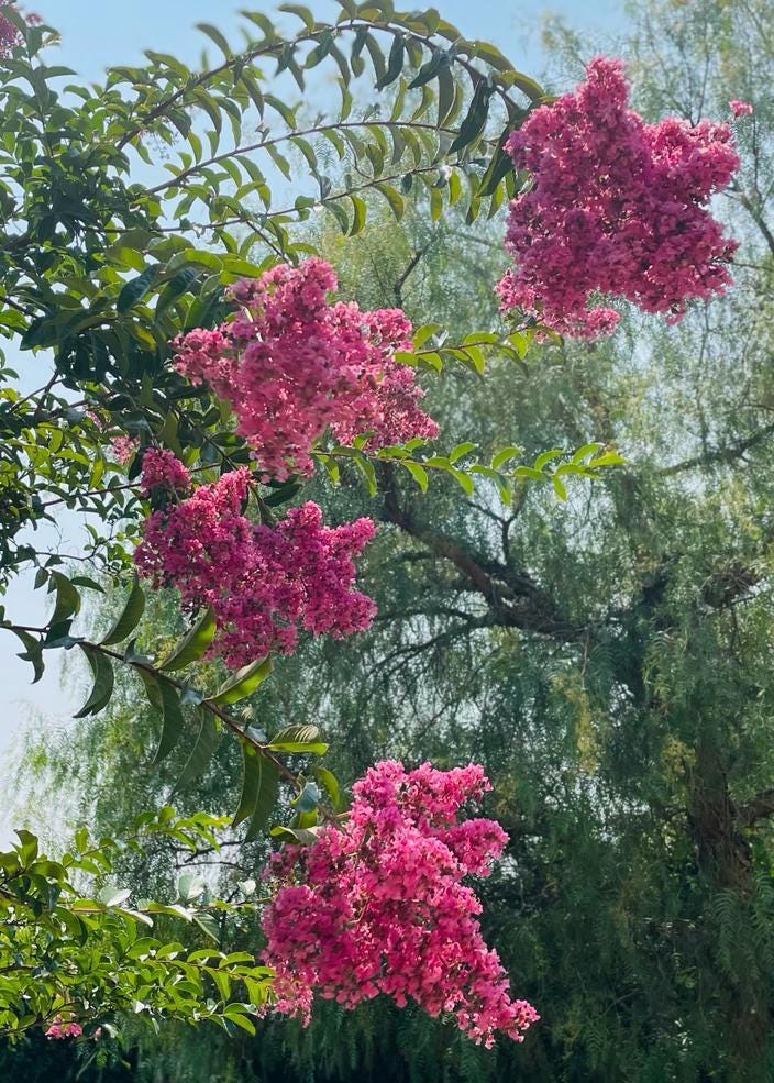 當初挑選品種,決定顏色時,我們選了粉紅色。其他由色彩分類,有紅薇、翠薇、銀薇、紫薇和複色紫薇。豐富多樣的深紅、淺紅、淡藍、濃紫、銀白、複色,絢麗璀璨。紅的如晴霞艶艶,白的如絳雪霏霏。