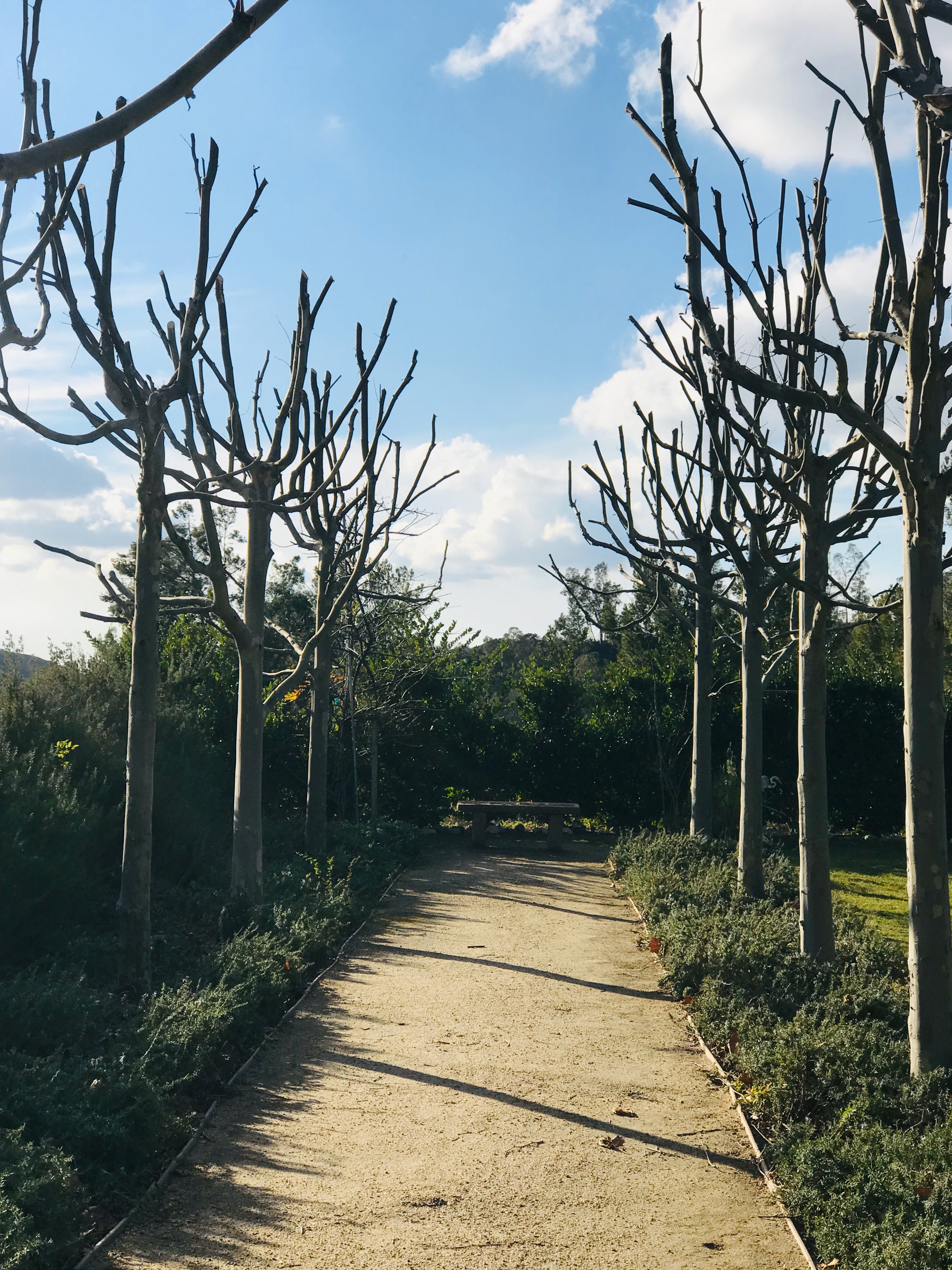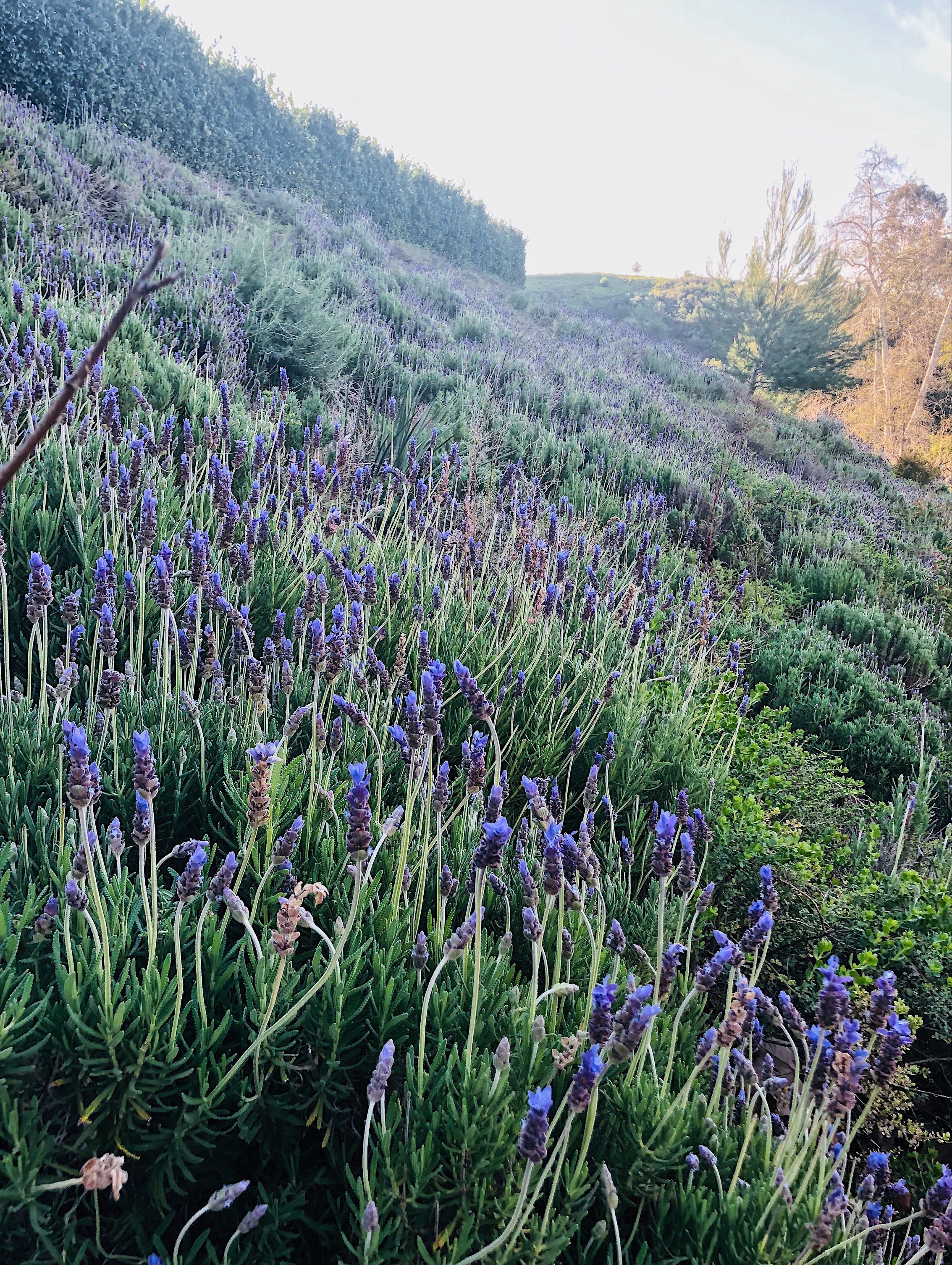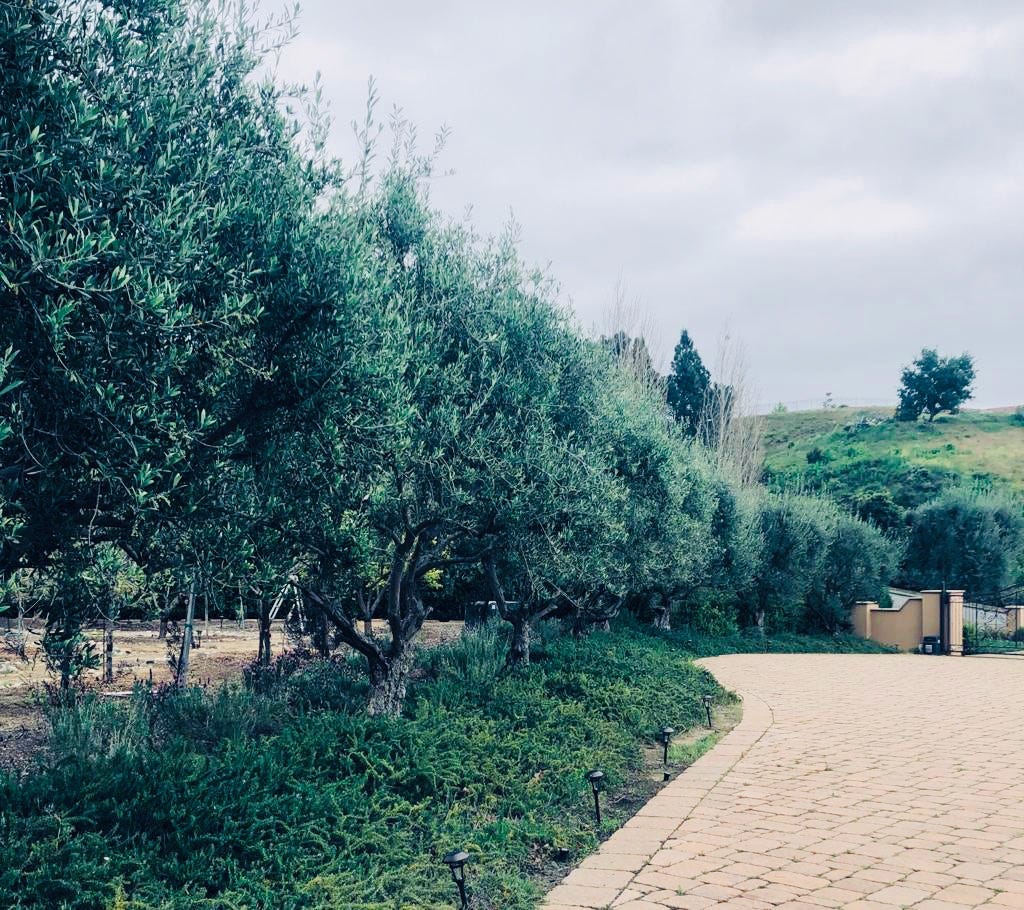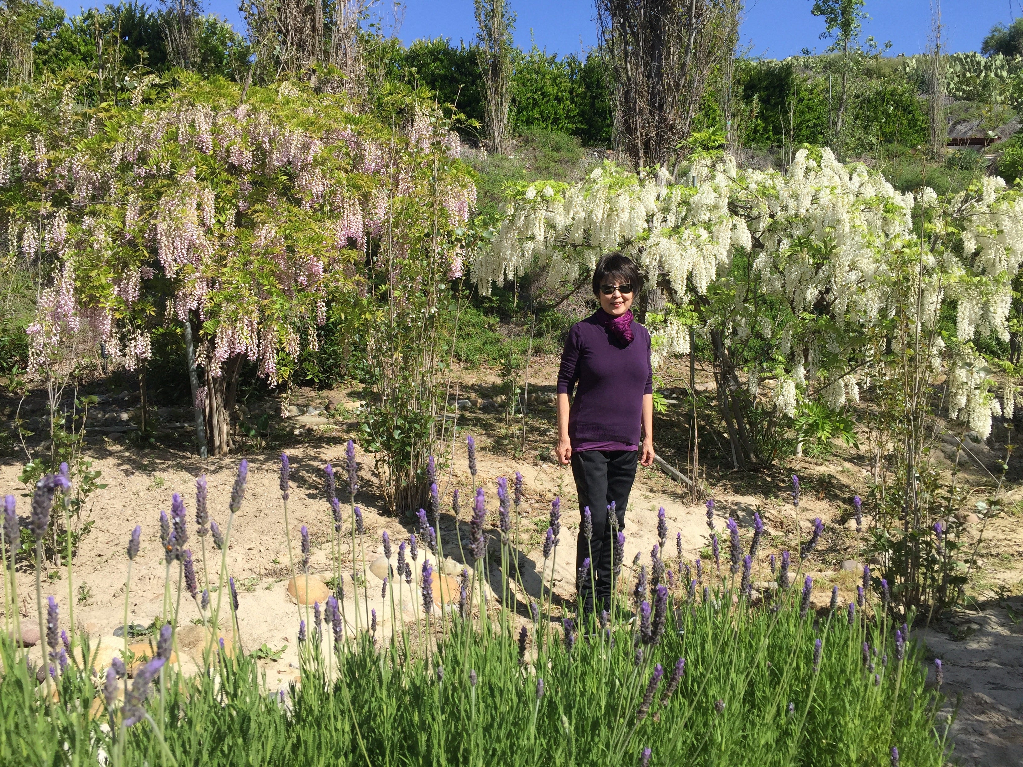 配合地中海型的房屋,十五棵五十到一百年樹齡的橄欖樹沿著車道種下,法國梧桐步道,銀杏步道,柑橘步道,白楊樹林,蘋果園,梅園等等一一就位。前庭的一側種了一排十株絲柏 Italian Cypress。絲柏有墨綠帶一點金黃、扁平的樹葉,修長優雅的樹身曲線,一排站立五十尺高,像挺直的廊柱,又像保護隱私的屏風,一年長三尺,高聳入雲,沒有什麼病蟲害,耐乾耐熱,不太挑剔土質,是理想的庭樹。