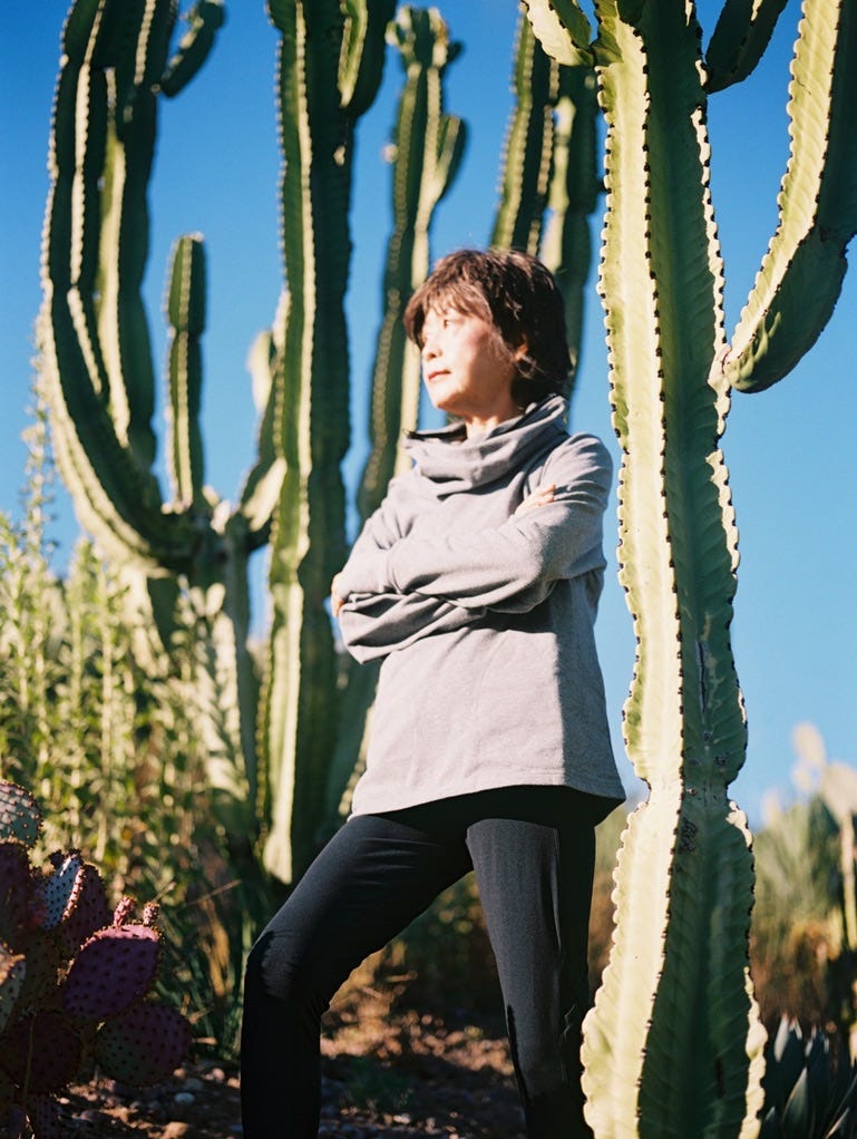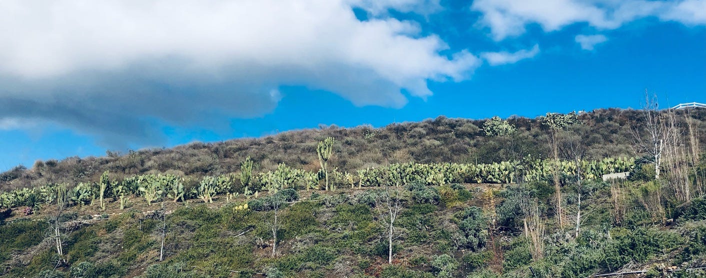 沿著園裡的登山步道上行,左邊是一片龍舌蘭,右邊是大片的海岸刺梨。春夏開花季節,放眼望去色彩繽紛,鮮黃嫩綠、紫紅橙橘,坐在石墩上看著白雲從仙人掌的盡頭緩緩飄向藍天,雖不是行到水窮處,也”坐看雲起時”了。