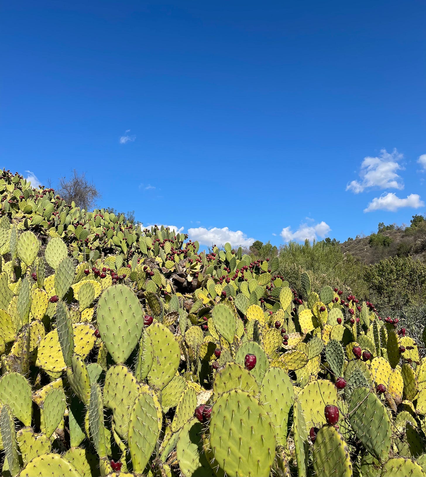 海岸刺梨長在山坡高處,在屋裡看不到它們背後的景觀。一位老友從台灣來家中小住,我們下班回家,他不好意思地説,”我白天看書看累了,出去園裡逛逛,看到這堵仙人掌牆,真害怕什麼時候一群紅蕃從山上殺下來!只好倒杯酒喝,壯壯膽!”我們笑他,”西部片看多了,想喝酒,還找得出這種理由。”
