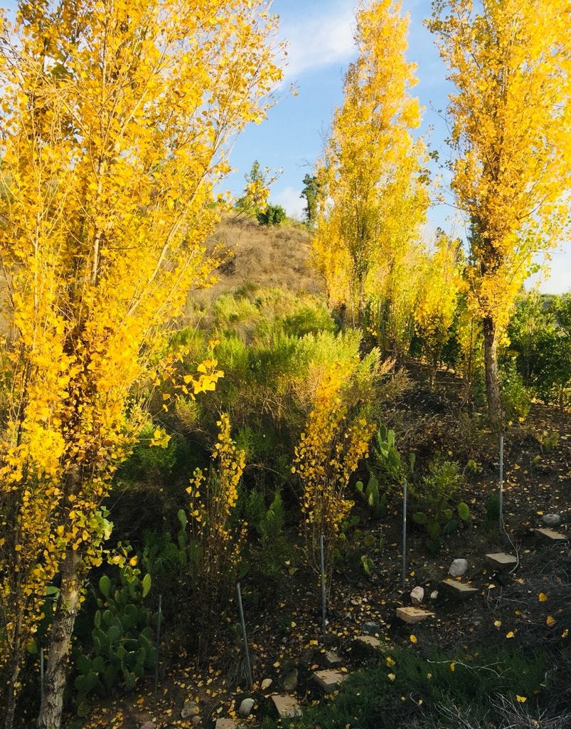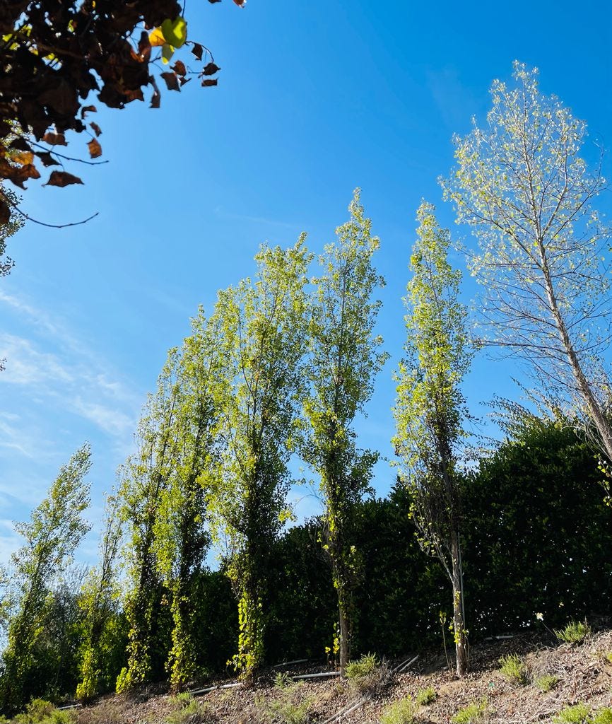 當年選擇種白楊樹,首先是喜歡它的色彩變換,和美麗的外形。十多株沿著街邊種下,前面是一排樹籬。很快地,它們迅速成長,已經高過樹籬,成為第二道樹牆,嚴嚴密密,保護隱私,也是擋風固土的綠牆。