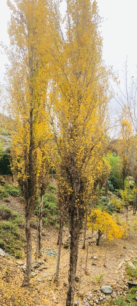 不像松柏,盤虬臥龍,終年長青; 不似柳樹,枝葉婆娑,婀娜多姿。傲然挺立的一排白楊樹,春夏之初,嫩葉翠綠,秋冬之際,轉為杏黃,寒冬來臨,枯褐乾葉鋪滿地面。落葉喬木,四季分明,變化多端。