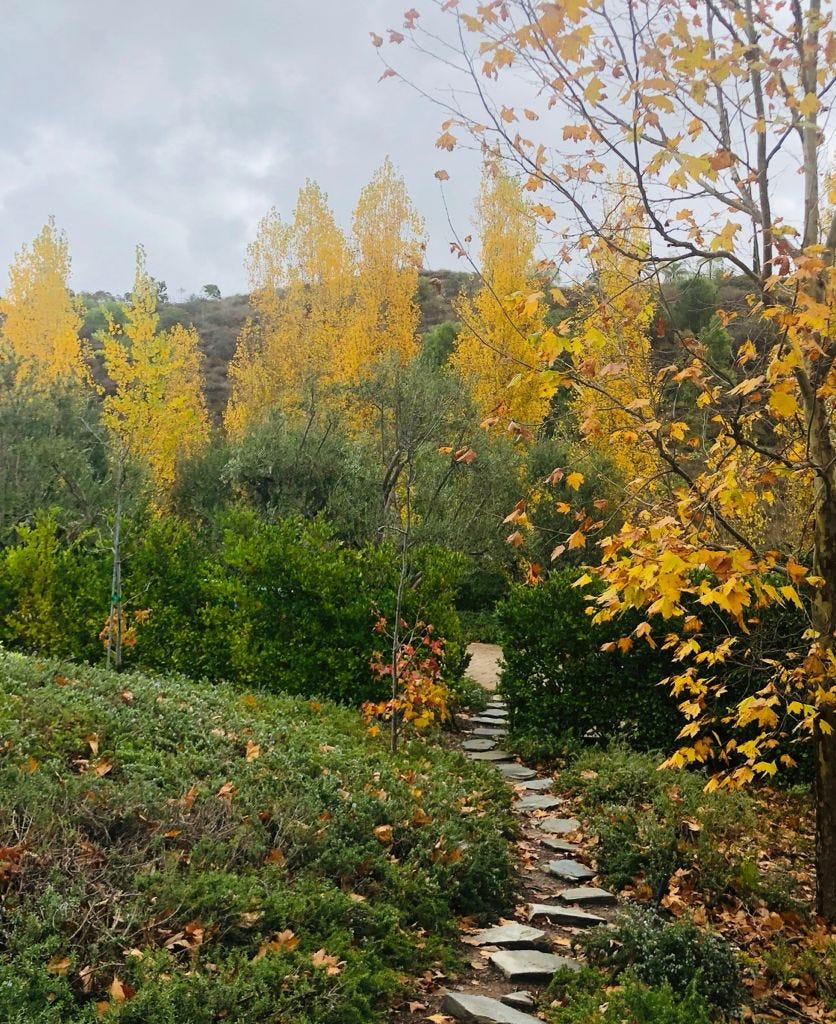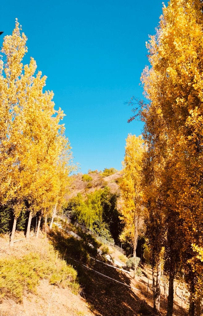 一汪小池的周邊有四、五十棵白楊樹環繞,一年四季色彩和形態的轉換,令人讚嘆不已。現在正是橙黃橘綠,樹樹皆秋色,山山唯落暉的季節。層層金黃的秋色染在法國梧桐、槭、楓、銀杏的樹葉上,遠處夕陽餘暉灑満了蕭颯的重重秋山。數樹深紅出淺黃,黃燦燦的白楊樹林,伴著紅紅火火的楓葉,正式登上絢麗的秋之舞台。