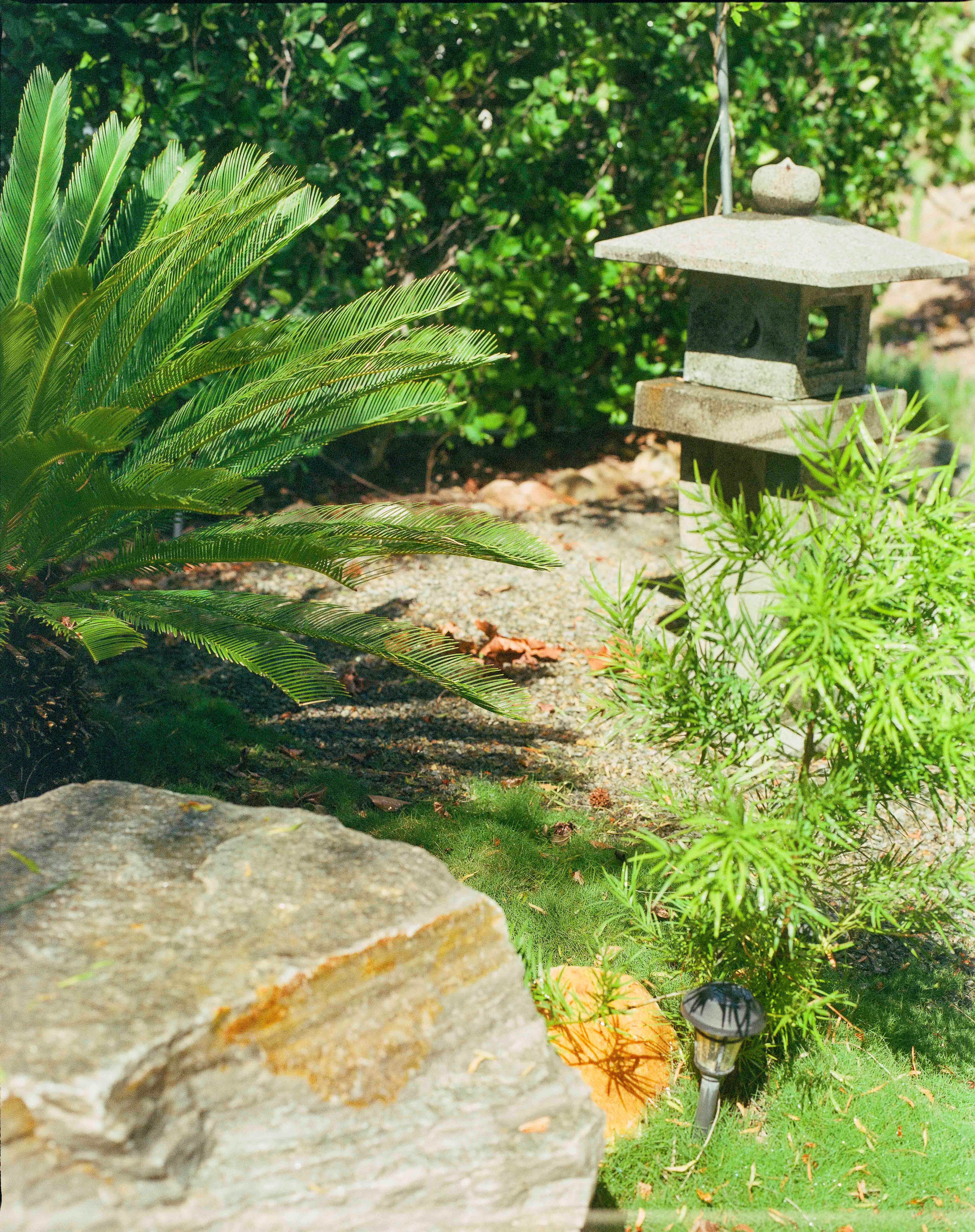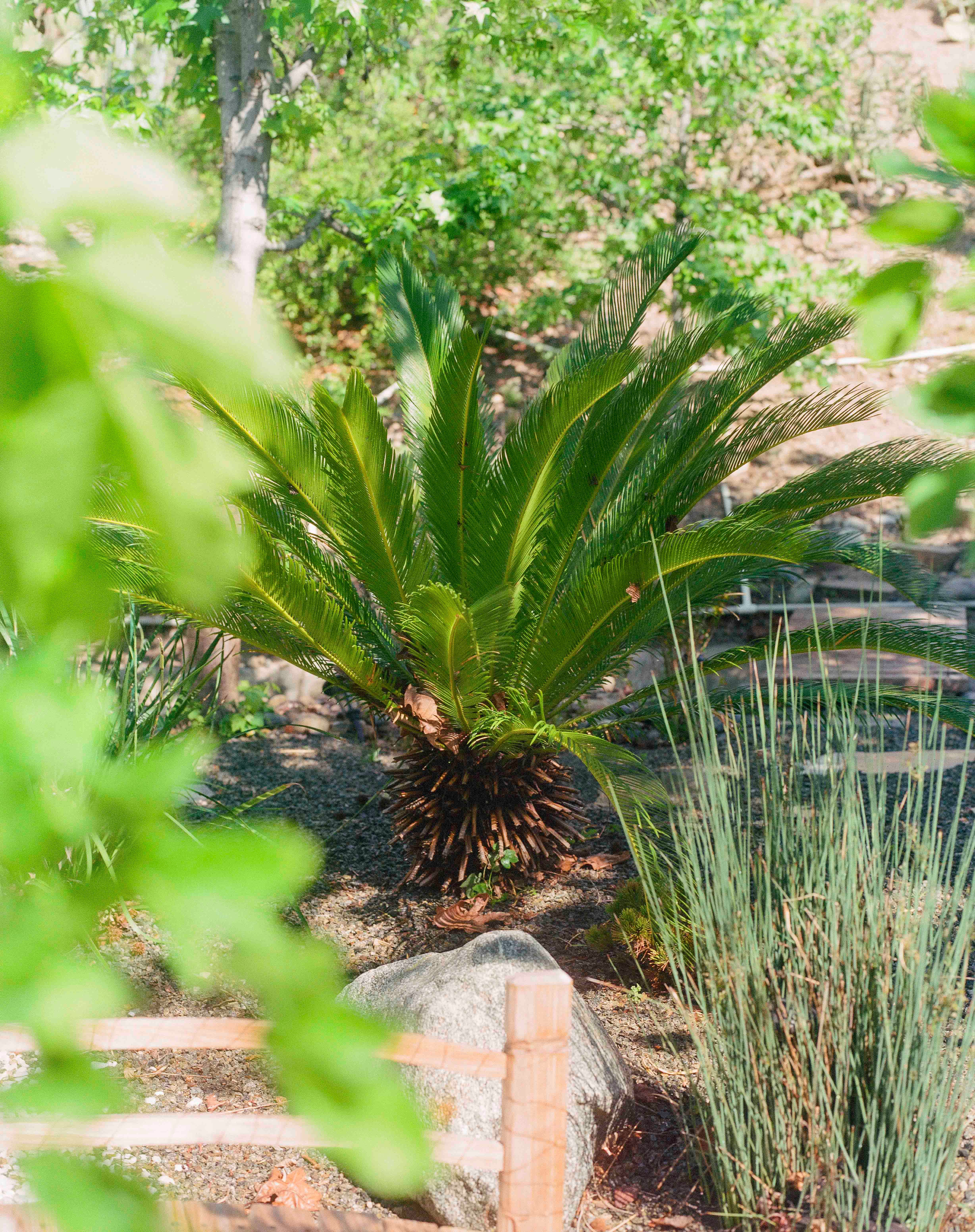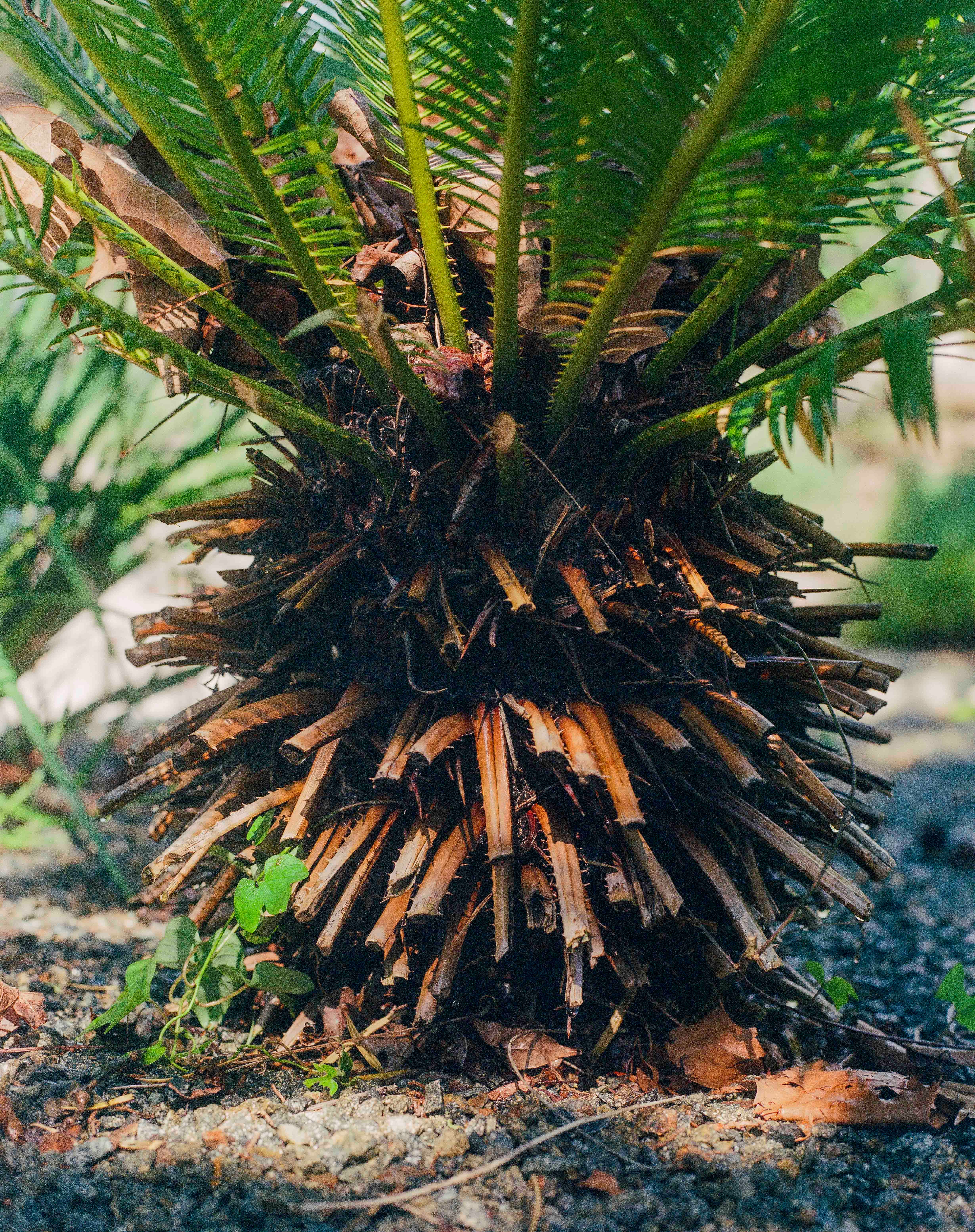 家中這兩株蘇鐵位在枯山水庭園,旁邊是巨岩和石燈籠,白石英碎石象徵的河水繞流過它們。樹下有矮種山松和杜鵑花陪伴,幽寂靜謐。蒼勁古樸的樹型架構,莖頂叢生向四方擴展的葉子,整齊優美如羽毛,配上不規則堅硬的岩石,具有禪意風情,冥想境界,古老優雅又陰陽調和。