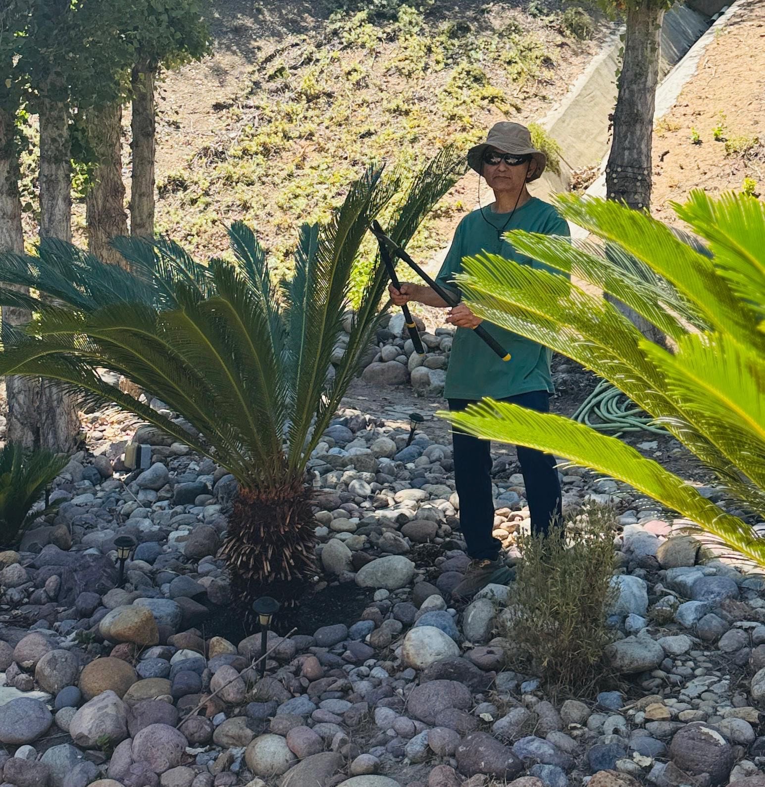 園丁三人費了大半天的功夫,小心翼翼地挖出這三大巨樹,運到家園,分別栽種在池塘邊和石頭花園𥚃。高度將近園丁的身高,約6英尺。一般蘇鐵的生長速度緩慢,一年最多只長幾英寸,壽命約200年。這三株在舊家,生長環境應該是非常理想,才能長得這麼高大美好。希望它們適應家園的氣溫濕度光線,接受周遭的改變,繼續扎根,站穩腳步,鎮守這片新園地。